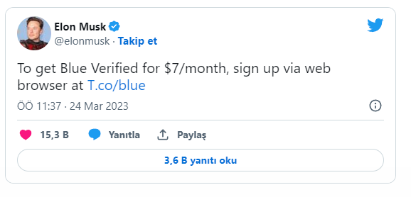 Platformada verdiyi açıqlamada Musk, "Twitter Verified artıq bütün dünyada istifadə oluna bilər!" yazıb. Musk mavi nişanın qiymətinin ayda 7 dollar olduğunu qeyd edib və üzvlük üçün link paylaşıb.