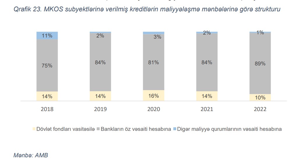 MKOS subyektlərinin kreditləşməsində bankların öz vəsaitlərinin payı artmaqdadır. Son illərdə bankların öz vəsaitləri hesabına MKOS subyektlərinin maliyyələşməsində aktiv iştirakı müşahidə edilir. Belə ki, 2022-ci ilin əvvəlindən etibarən bankların öz vəsaiti hesabına verilmiş kreditlərin həcmi 35% (1.3 milyard manat) artaraq 5 milyard manata çatmışdır. Nəticədə, bankların öz vəsaiti hesabına MKOS subyektlərinə verilmiş kreditlərinin biznes portfelində xüsusi çəkisi 5 faiz bəndi artaraq 89% olmuşdur. MKOS-ların maarifləndirmə imkanlarının təşviqi və maliyyə resurslarına çıxış imkanlarının genişləndirilməsi ilə bağlı fəaliyyət istiqamətləri “Azərbaycan Respublikasının 2022-2026-cı illərdə sosial-iqtisadi inkişaf Strategiyası”nda öz əksini tapmışdır.