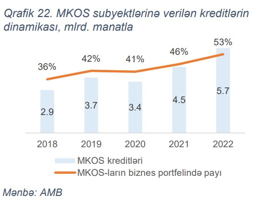 2022-ci il ərzində mikro, kiçik və orta sahibkarların (MKOS) kreditləşməsində müsbət artım trendi davam etmişdir. Belə ki, ilin əvvəli ilə müqayisədə MKOS subyektlərinə verilən kreditlərin həcmi 28% artaraq 5.7 milyard manata çatmışdır. Nəticədə, MKOS-lara verilmiş kreditlərin biznes portfelində payı 50%-i ötmüşdür.
