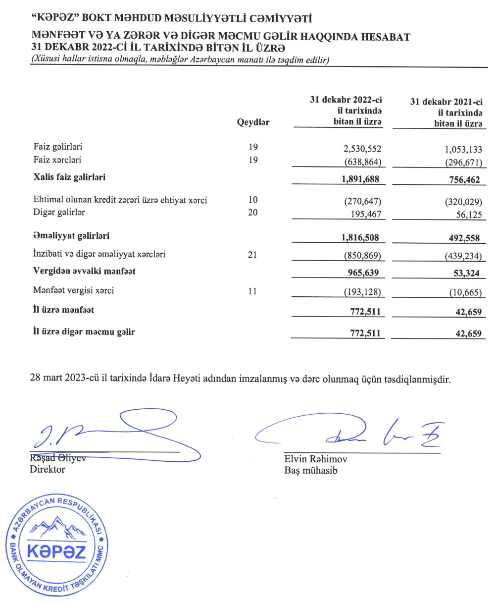 "Kəpəz BOKT" MMC 2022-ci ili 772 min 511 manat xalis mənfəət ilə başa vurub. Bank olmayan kredit təşkilatı 2021-ci ili 42 min 659 manat xalis mənfəət ilə bağlamışdı. Beləliklə, 2021-ci illə müqayisədə 2022-ci ildə "Kəpəz BOKT"un xalis mənfəəti 18 dəfədən çox artıb. Xalis mənfəətin artması əsasən gəlirlərin artmasından qaynaqlanır.