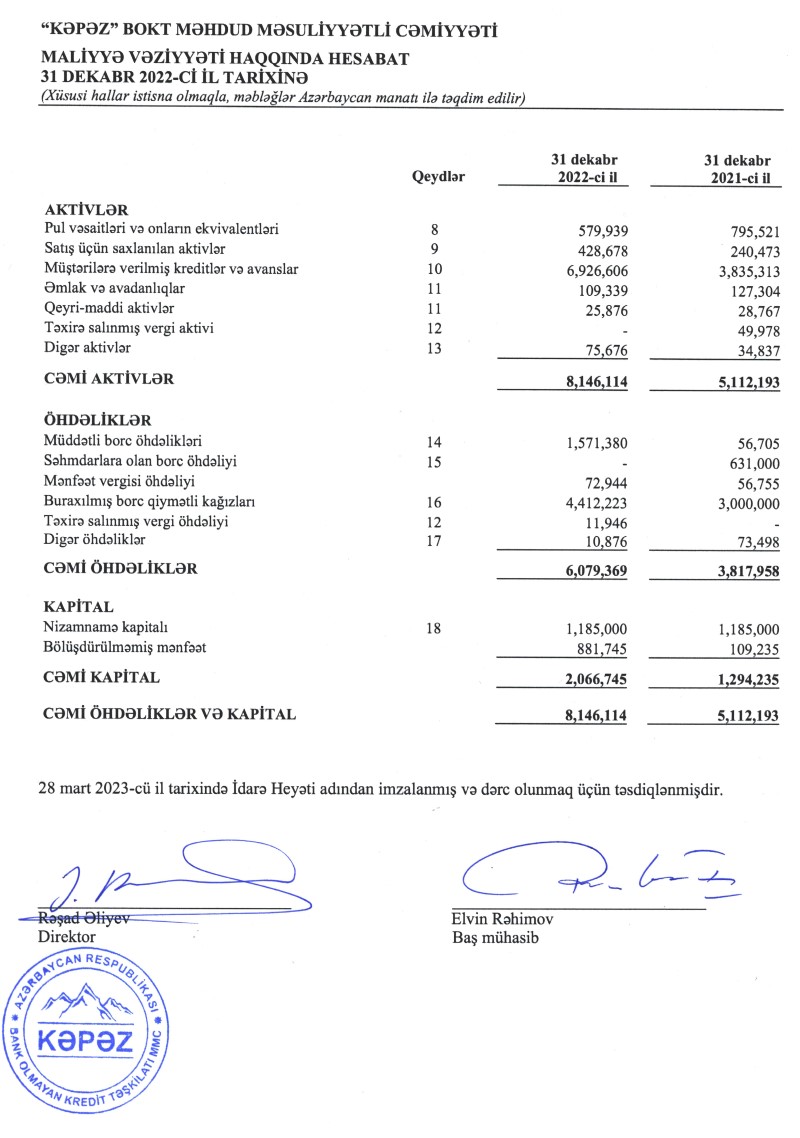 Ötən il "Kəpəz BOKT"un cəmi kapitalı 59,6% artaraq 31 dekabr 2022-ci il tarixində 2 milyon 67 min manat təşkil edib (2021-ci ilin sonunda 1 milyon 294 min manata çatmışdı).