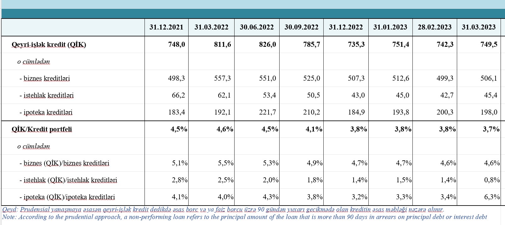 31.03.2023-cü il tarixində biznes kreditlərinin 506,1 milyon manatını və ya 4,6%-ni, istehlak kreditlərinin 45,4 milyon manatını və ya 0,8%-ni, ipoteka kreditlərinin isə 197,9 milyon manatını və ya 6,3%-ni qeyri-işlək kreditlər təşkil edib (cəmi qeyri-işlək kreditlər 749,5 milyon manat olub).