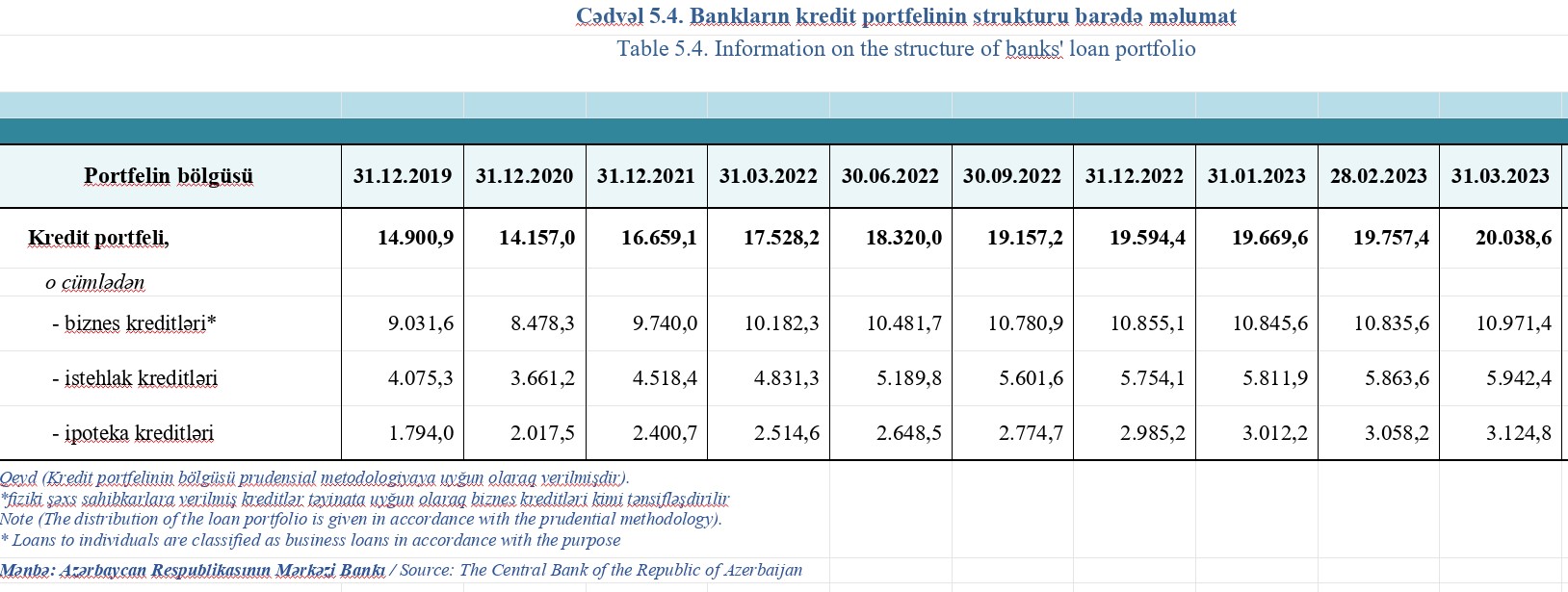 31 Mart 2023-cü il tarixində, əhalinin banklara cəmi borcunu göstərən istehlak və ipoteka kreditləri üzrə cəmi qalıq kredit 9 milyard 67 milyon 199 min manat təşkil edib. İlin ilk 3 ayında bu iki kredit üzrə artım 327 milyon 896 min manat təşkil edib. Ötən ilin sonunda istehlak və ipoteka kreditləri üzrə cəmi qalıq borc 8 milyard 739 milyon 304 min manat təşkil etmişdi.