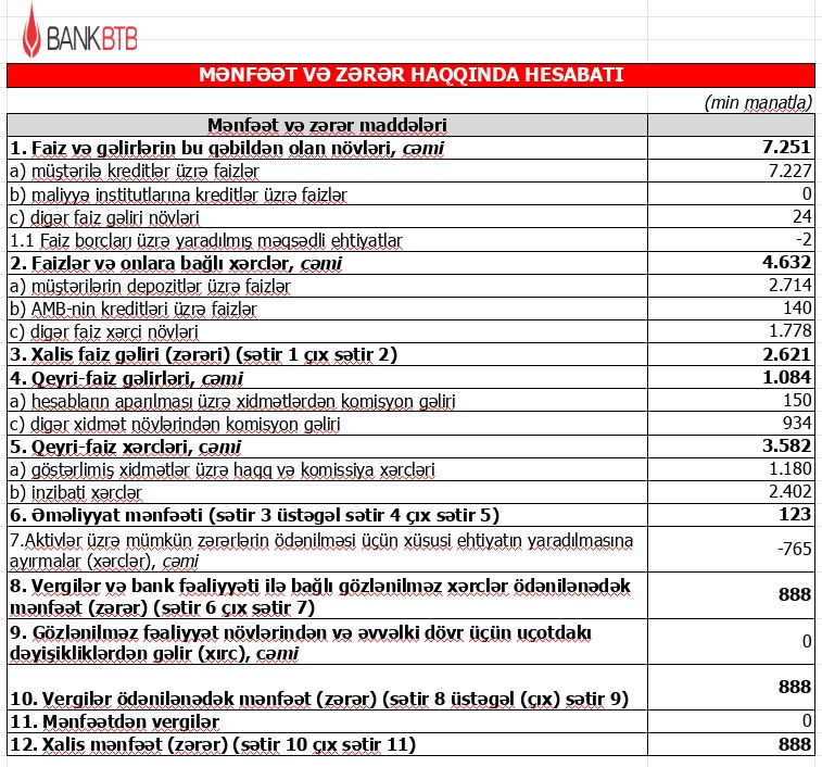 "Bank BTB" ASC 2023-cü ilin 1-ci rübünü (yanvar-mart) 888 min manat xalis mənfəət ilə başa vurub. Bank ötən ilin eyni dövrünü 3 milyon 295 min manat xalis zərər ilə bağlamışdı.