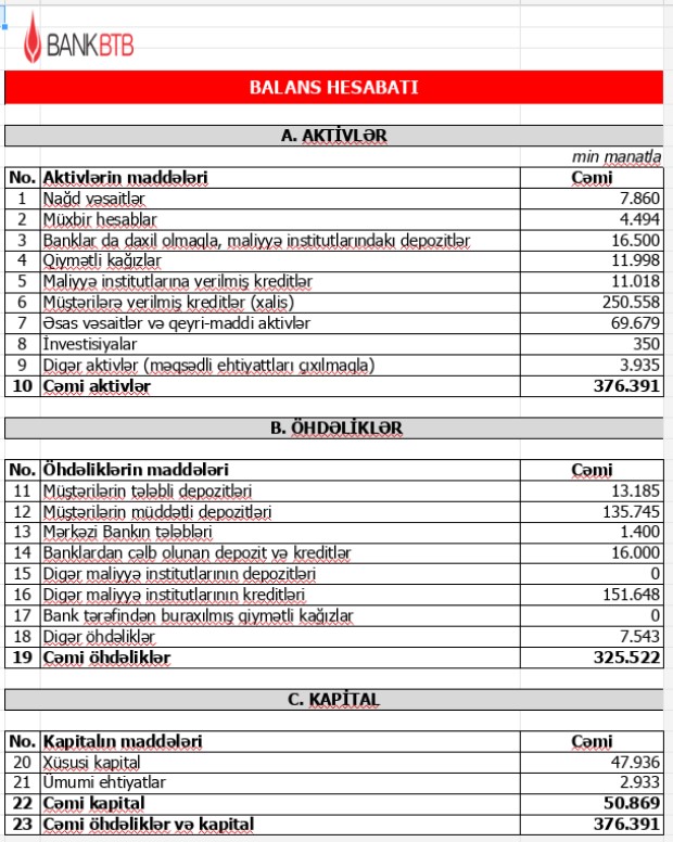 31 Mart 2023-cü il tarixində "Bank BTB" 376 milyon 391 min manat cəmi aktivlərə, o cümlədən 250 milyon 558 min manat xalis kredit portfelinə malik olub. Bank ötən ilin eyni tarixində 356 milyon 788 min manat cəmi aktivlərə, o cümlədən 247 milyon 438 min manat xalis kredit portfelinə malik idi.