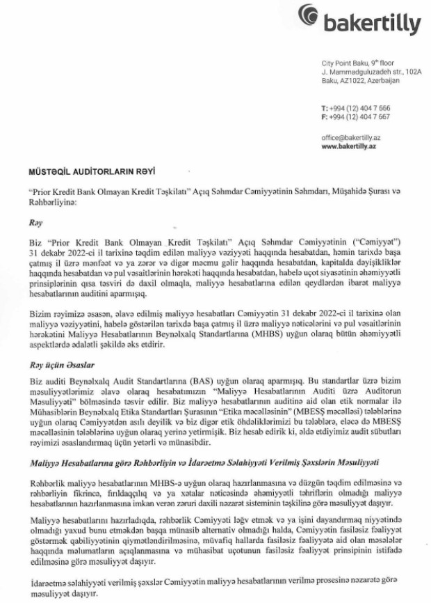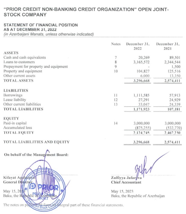 "Prior Kredit BOKT" ASC 2022-ci il üzrə maliyyə hesabatlarını açıqlayıb.