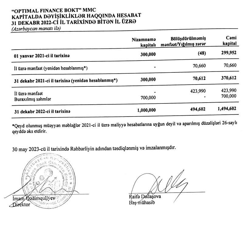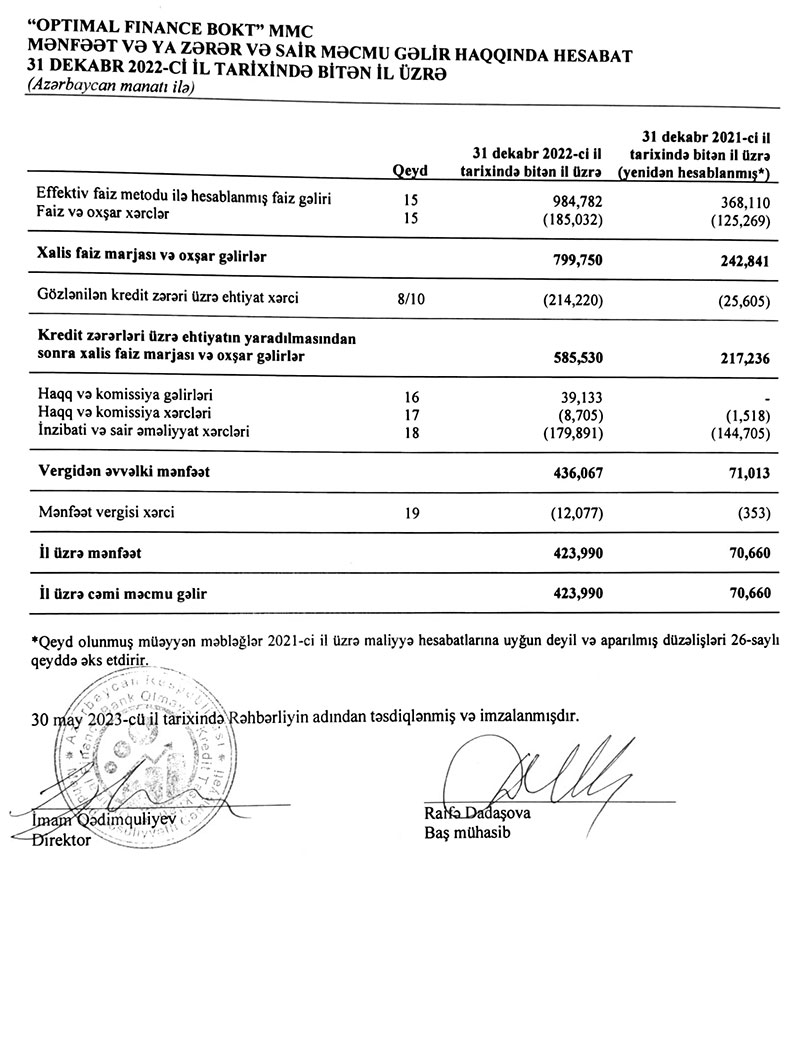 Azərbaycan Respublikasının Mərkəzi Bankı tərəfindən 29 dekabr 2020-ci il tarixdə verilmiş BKT-37 nömrəli lisenziya əsasında fəaliyyət göstərən “Optimal Finance Bank Olmayan Kredit Təşkilatı” Məhdud Məsuliyyətli Cəmiyyətinin 2022-ci il üçün kənar auditor tərəfindən təsdiqlənmiş illik maliyyə hesabatı ilə aşağıda tanış ola bilərsiniz.