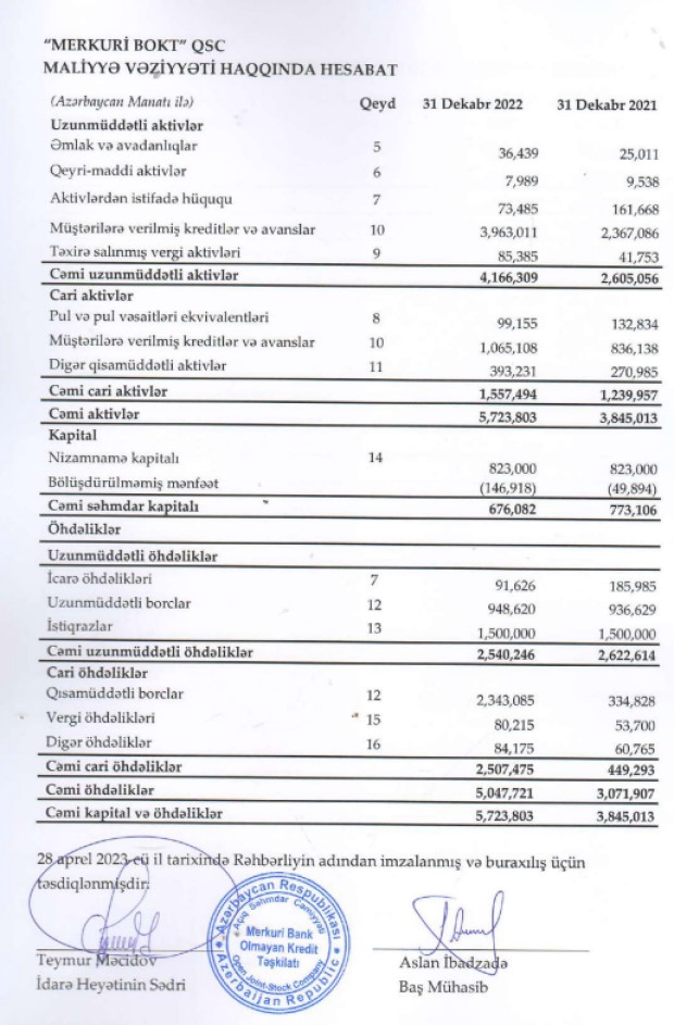 Ötən il “Merkuri BOKT"ın kredit portfeli 1 milyon 595 min manat artaraq 31 Dekabr 2022-ci il tarixində 3 milyon 963 min manata çatıb.