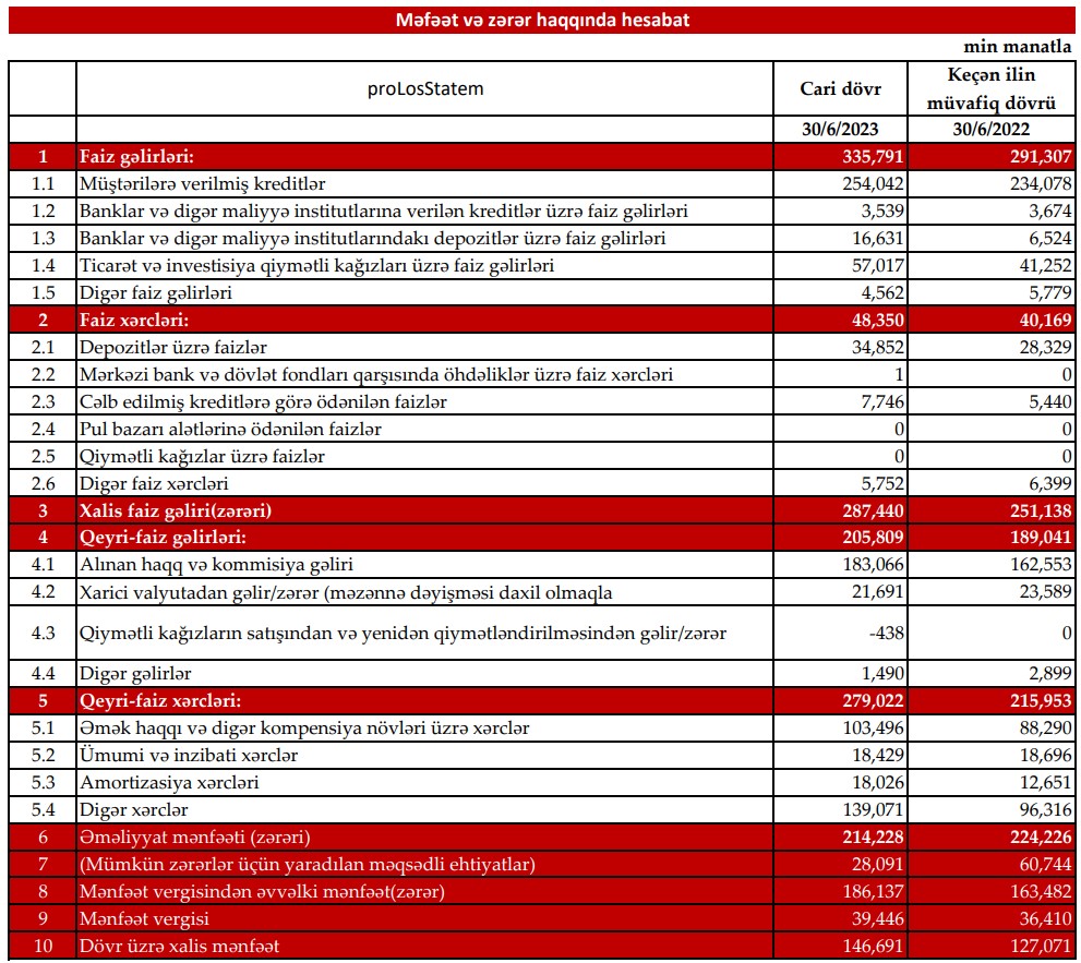 Müqayisə üçün qeyd edək ki, 2022-ci ilin birinci yarısında "Kapital Bank"ın cəmi əməliyyat gəlirləri 480 milyon 348 min manat, cəmi əməliyyat xərcləri 256 milyon 122 min manat, əməliyyat mənfəəti 224 milyon 226 min manat təşkil etmişdi.