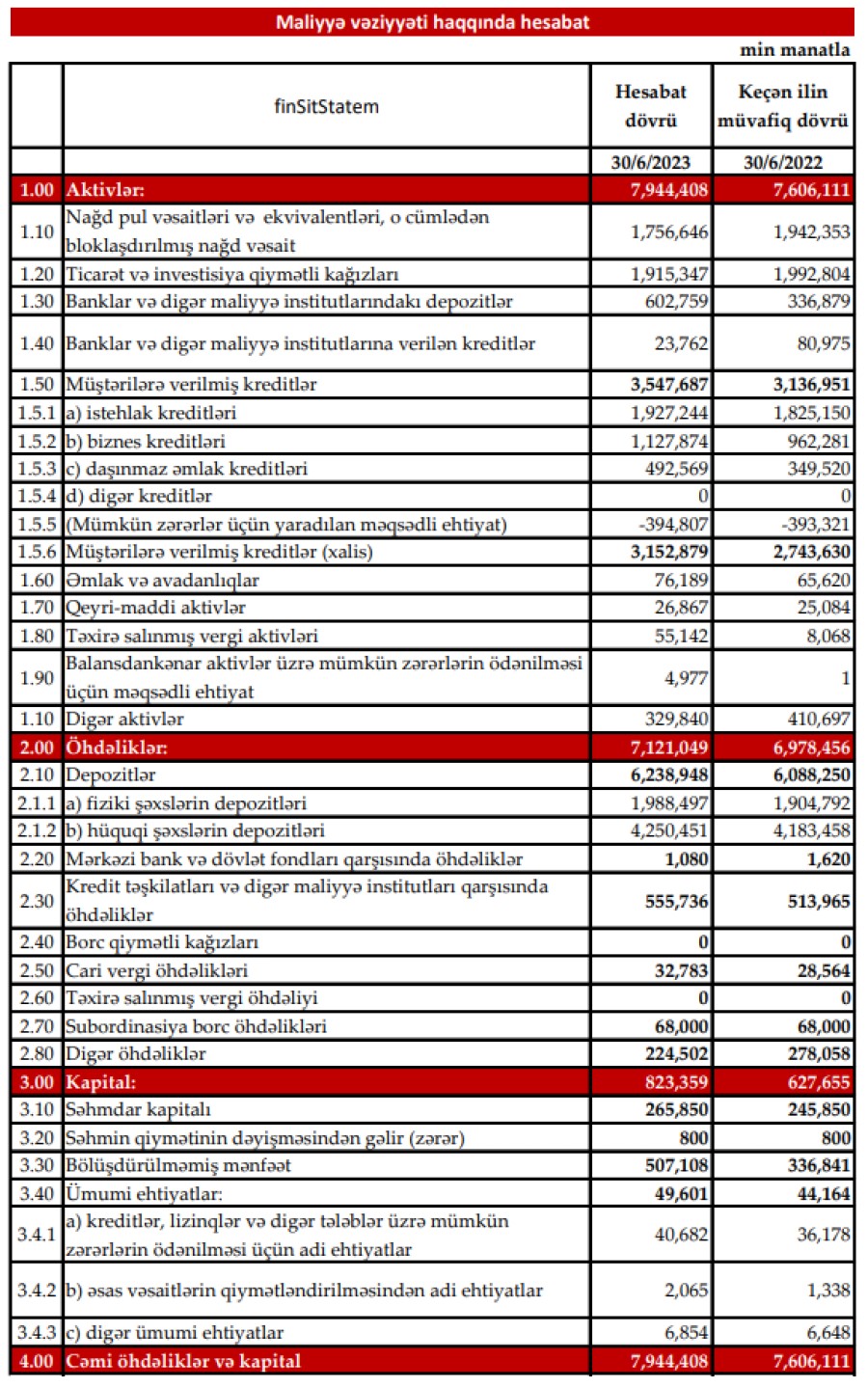"Kapital Bank" ASC-nin cəmi aktivləri ötən ilin birinci yarısının sonu ilə müqayisədə 338 milyon 297 min manat və ya 4,4% artaraq 30 İyun 2023-cü il tarixində 7 milyard 944 milyon 408 min manat təşkil edib. Ötən ilin 30 İyun tarixində Bank 7 milyard 606 milyon 111 min manat cəmi aktivlər əmalik idi.