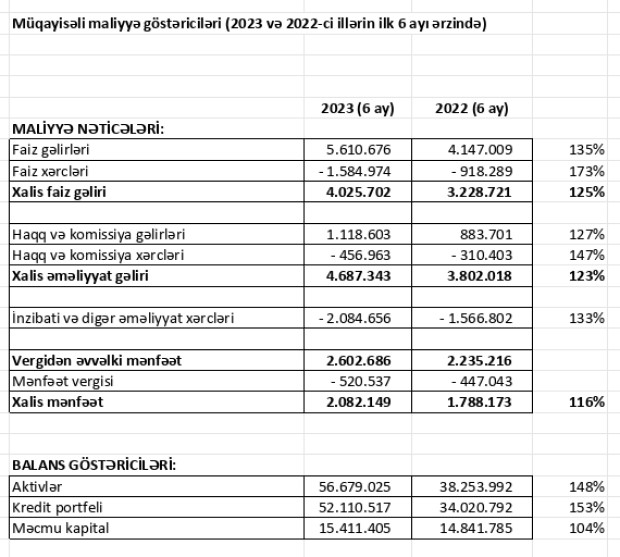 Marja.az xəbər verir ki, "Embafinans" 2023-cü ilin ilk 6 ayını 2 milyon 82 min manat xalis mənfəət ilə başa vurub. Ötən ilin eyni dövrü ilə müqayisədə Təşkilatın xalis mənfəəti 294 min manat və ya 16% artıb.