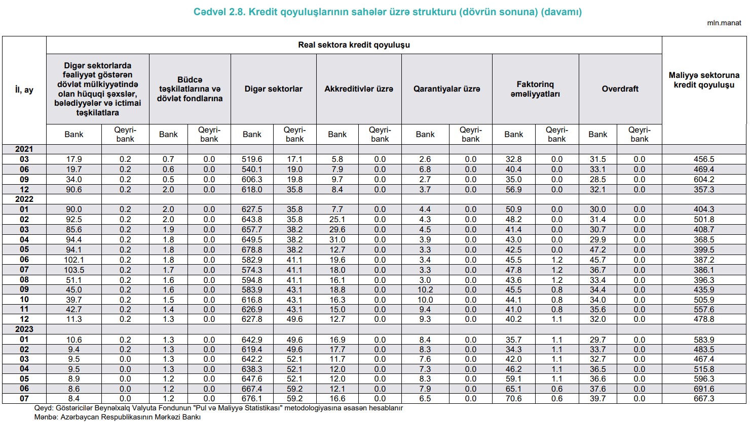 İyun ayının sonunda faktorinq əməliyyatlarının həcmi banklar üzrə 65,1 milyon manat, ötən ilin sonunda isə 40,2 milyon manat təşkil etmişdi. Beləliklə, bankların faktorinq əməliyyatları üzrə kredit qoyuluşları 30,4 milyon manat və ya 75,6% artıb.