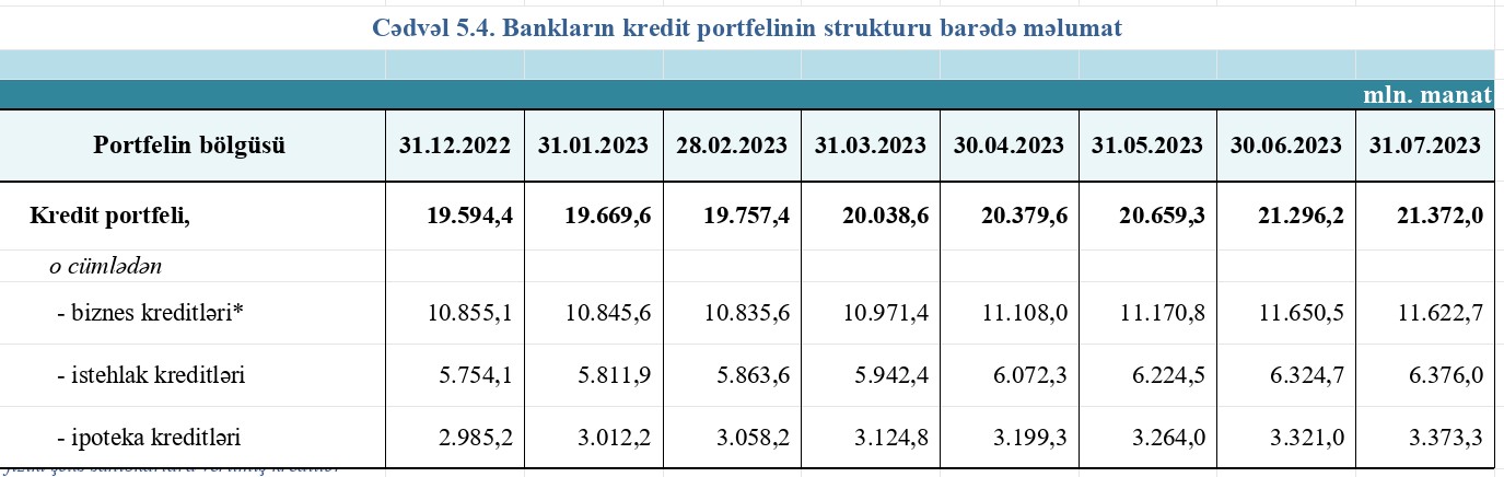 İyul ayında bankların cəmi kredit portfeli 75,8 milyon manat artaraq 21 milyard 372 min manata çatıb. O cümlədən, istehlak kreditləri portfeli 51,3 milyon manat artaraq 6 milyard 376 milyon manata, ipoteka kreditləri portfeli isə 52,3 milyon manat artaraq 3 milyard 373,3 milyon manata yüksəlib.