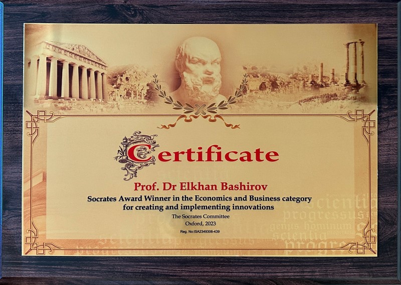 (®) Beynəlxalq Sokrat Mükafatı (İnternational Socrates Award) Avropanın ən nüfuzlu mükafatlarından biridir. Avropa Biznes Assambleyasının ekspertləri tərəfindən hər il müxtəlif ölkələr üzrə iqtisadiyyatın inkişafına böyük töhfələr verən nüfuzlu təşkilatlar, o cümlədən onlara rəhbərlik edən şəxslər bu mükafatla təltif olunurlar.