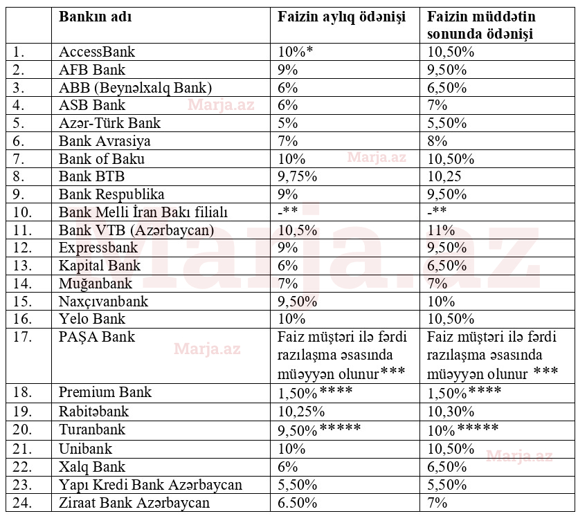 “Marja.az” araşdırmasına əsasən, hazırda 12 ay müddəti üzrə ən yüksək əmanət faizlərini Bank VTB Azərbaycan, AccessBank, Bank of Baku, Unibank, Yelo Bank, Bank BTB, Rabitəbank, Naxçıvanbank və Turanbank təklif edir.