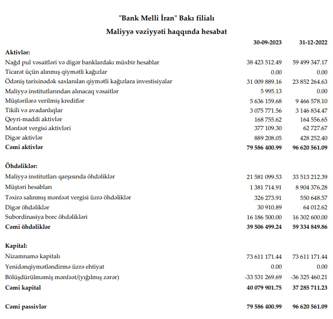 2023-cü ilin yanvar-sentyabr dövründə "Bank Melli İran" Bakı filialının cəmi aktivləri 17 milyon 34 min manat və ya 17% azalaraq 79 milyon 586 min manat düşüb. Geriləmə əsasən nağd pul vəsaitləri və digər banklardakı müxbir hesablardakı vəsaitlərin azalması ilə əlaədardır.
