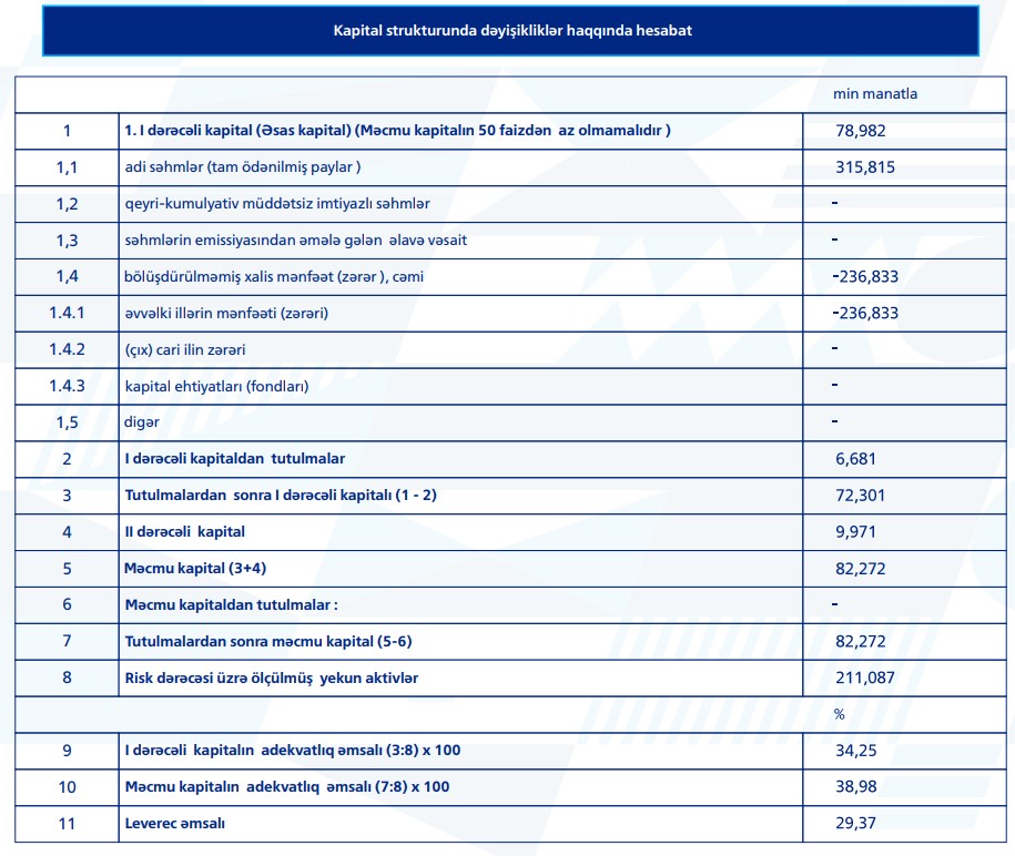 30 sentyabr tarixinə bankın məcmu kapitalı ilin əvvəlindən 2,6% artaraq 82 milyon 272 min manat təşkil edib və Azərbaycan Mərkəzi Bankının minimum tələblərini 64%-dən çox üstələyir.
