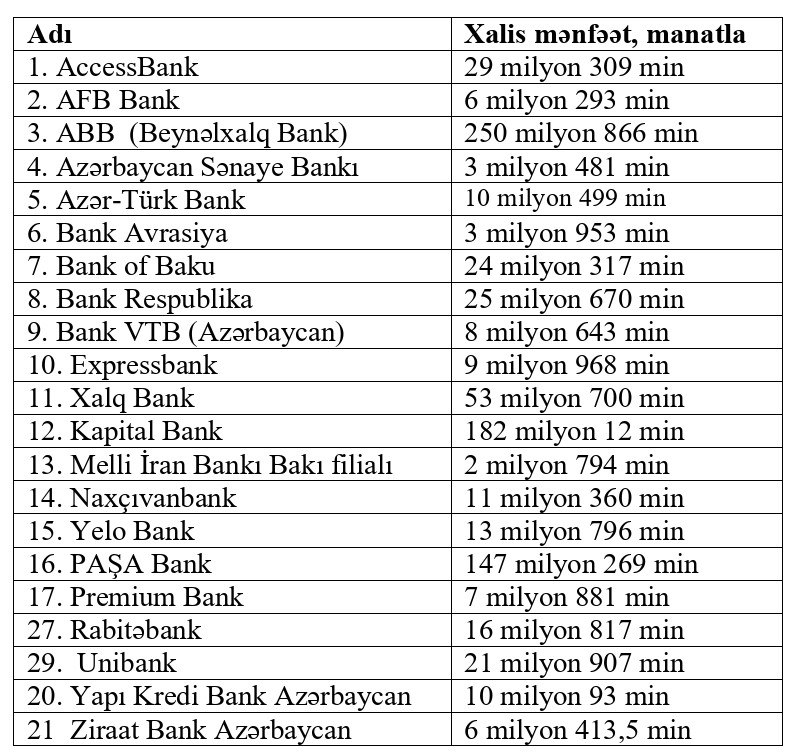 21 bank xalis mənfəət açıqladı