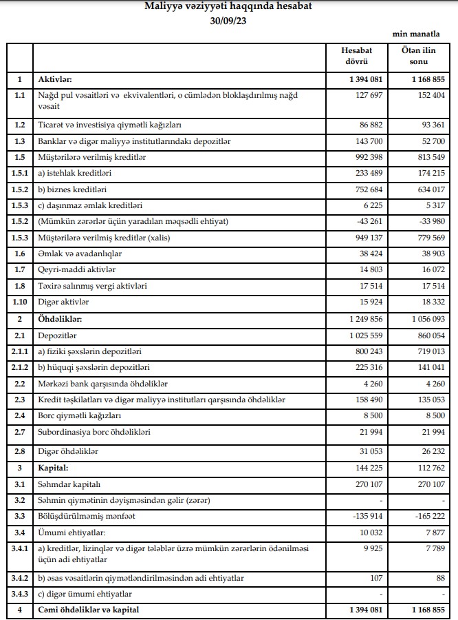 Bütövlükdə, Bankın aktivləri ötən ilin müvafiq dövrü ilə müqayisədə 32.5% artaraq, hesabat dövrünün sonunda 1.4 milyard manata çatır.