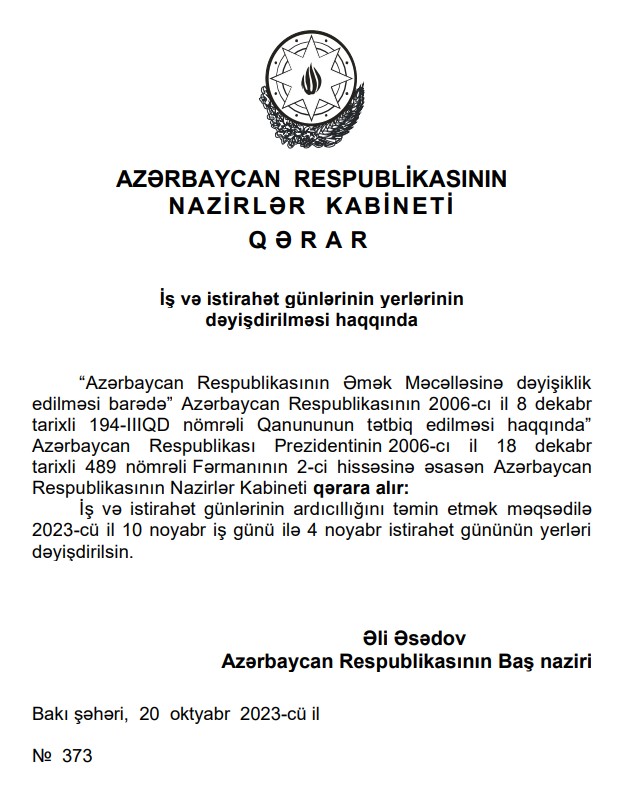 Qərara əsasən, iş və istirahət günlərinin ardıcıllığını təmin etmək məqsədilə 2023-cü il 10 noyabr iş günü ilə 4 noyabr istirahət gününün yerləri dəyişdirilib.