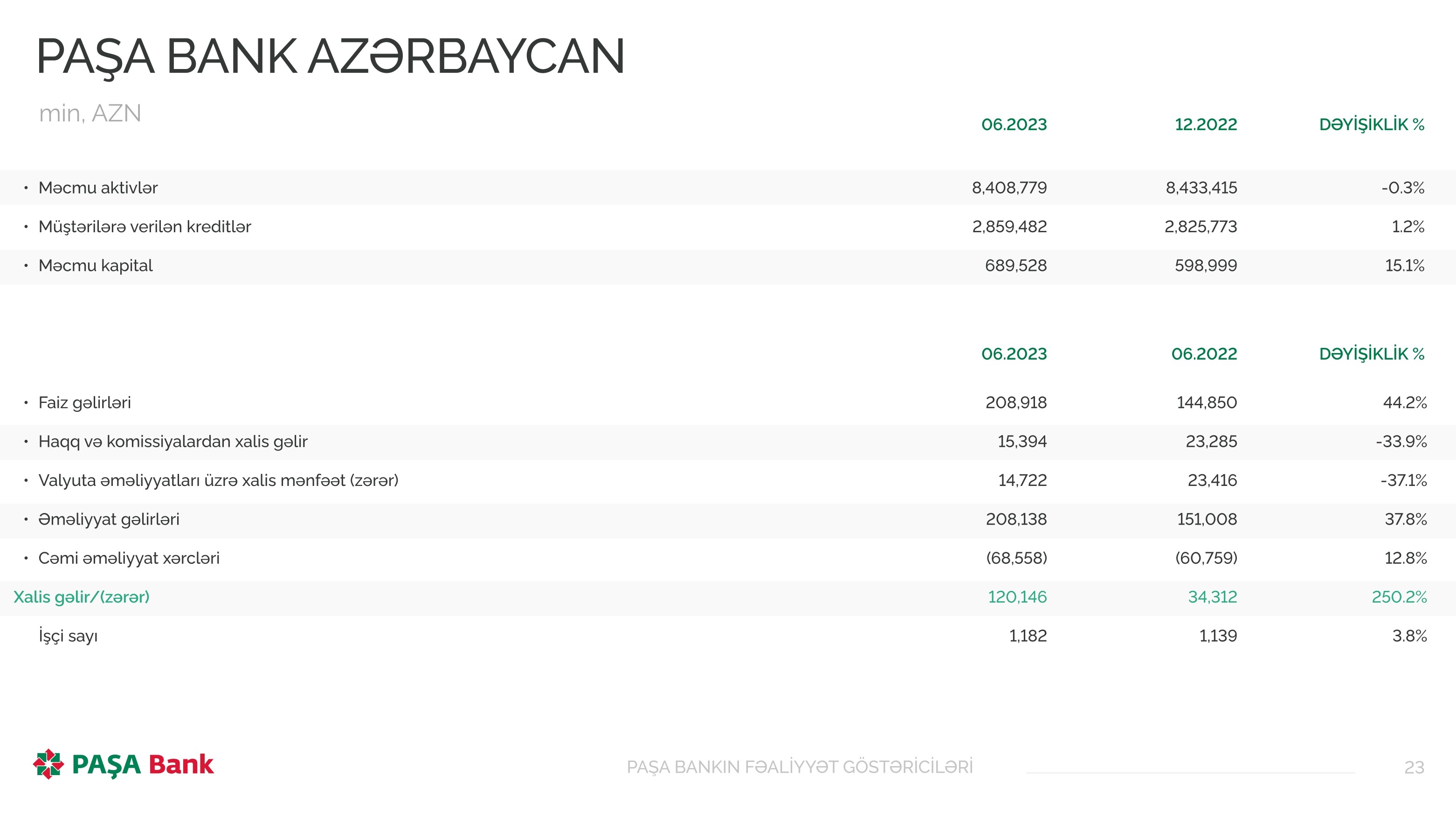 "PAŞA Bank" Azərbaycan isə 2023-cü ilin ilk 6 ayında 120 milyon 146 min manat xalis mənfəət əldə edib.