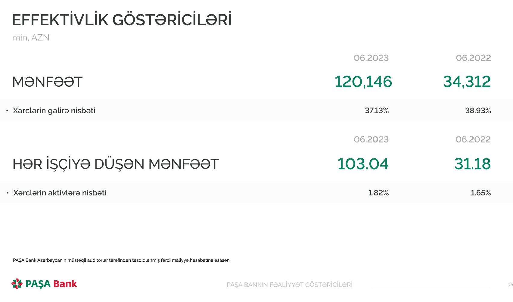 Marja.az xəbər verir ki, Bankın İdarə heyətinin üzvü və baş maliyyə inzibatçısı Murad Süleymanov bildirib ki, "PAŞA Bank" ASC 2023-cü ilin ilk 6 ayını 120 milyon 146 min manat xalis mənfəət ilə başa vurub. Bank 2022-ci ilin eyni dövrünü 34 milyon 312 min manat xalis mənfəət ilə başa vurmuşdu. Bu ilin birinci yarısında "PAŞA Bank"ın xalis mənfəətində 3,5 dəfə artım qeydə alınıb ki, bu da rekord artımdır.