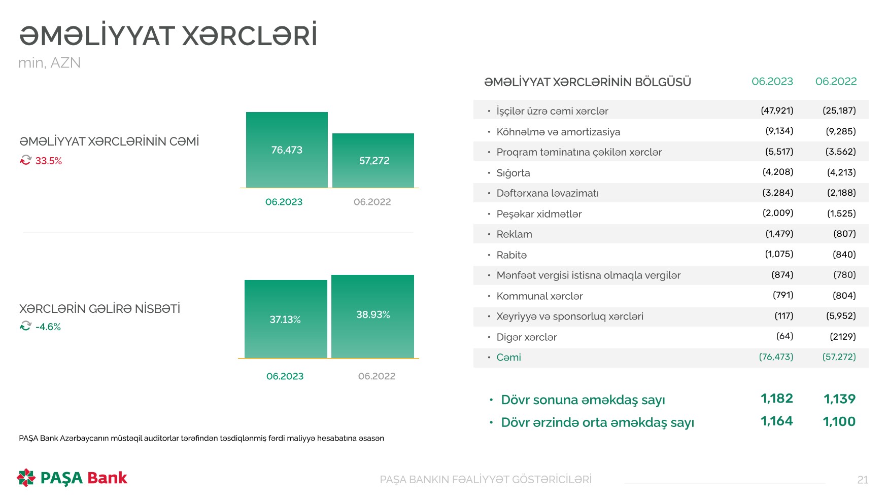 2023-cü ilin ilk 6 ayında “PAŞA Bank”ın işçilər üzrə cəmi xərcləri 47 milyon 921 min manat təşkil edib ki, bu da ötən ilin eyni dövrü ilə müqayisədə 22 milyon 734 min manat və ya 90% çoxdur. Cari ilin 6 ayında Bankın işçibaşına xərcləri isə ortahesabla 40 min 542 manat olub.