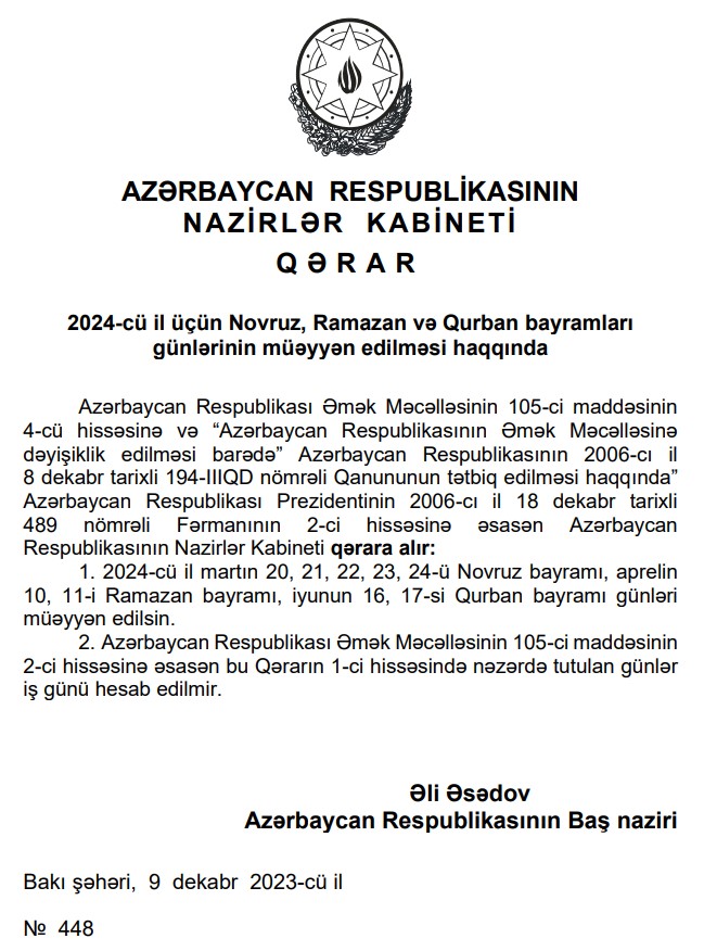 2024-cü il martın 20, 21, 22, 23, 24-ü Novruz bayramı, aprelin 10, 11-i Ramazan bayramı, iyunun 16, 17-si Qurban bayramı günləri müəyyən edilib.