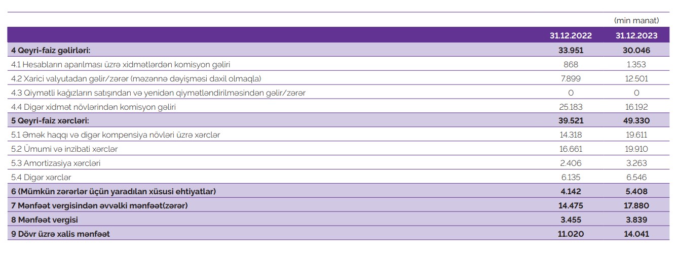 2023-cü ildə "Azər-Türk Bank" 14 milyon manat həcmində xalis mənfəət əldə etmişdir ki, bu da ötən dövrdəki göstəricidən 28% çoxdur.