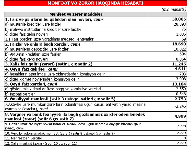 Müqayisə üçün qeyd edək ki, 2022-ci ildə Bank "BTB"nin cəmi əməliyyat gəlirləri 31 milyon 631 min manat, cəmi əməliyyat xərcləri 31 milyon 189 min manat, gəlirlər xərcləri üstələdiyindən əməliyyat mənfəəti 442 min manat təşkil etmişdi.