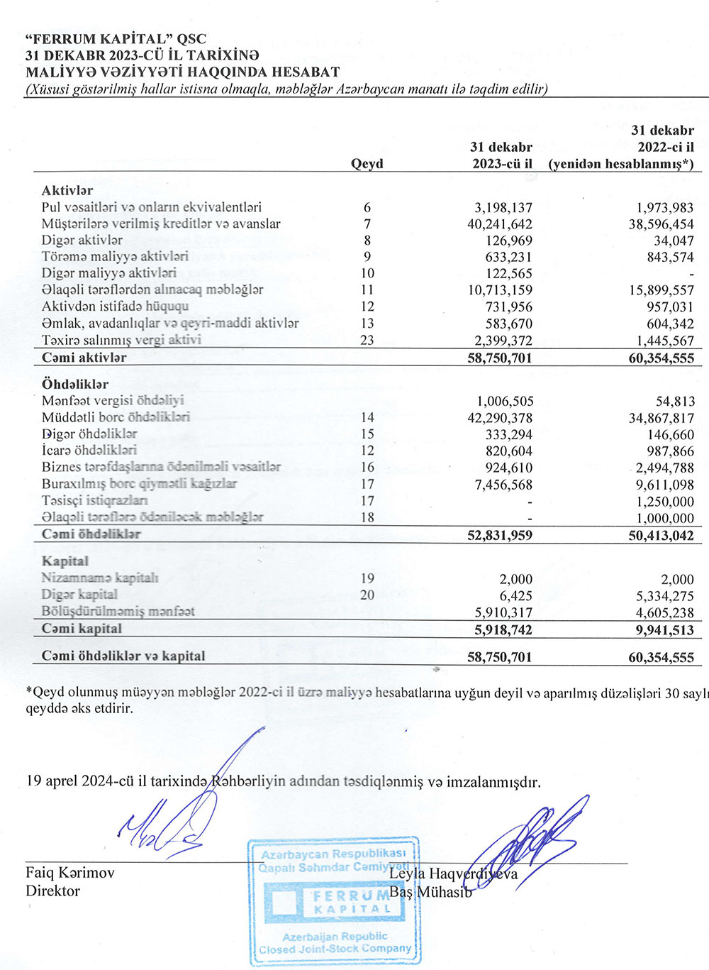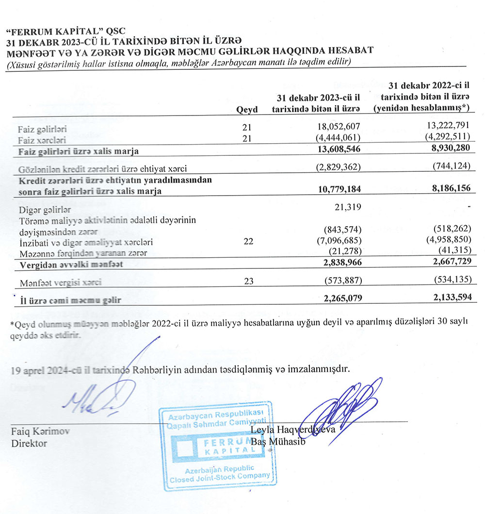 "Ferrum Kapital" QSC 2023-cü ili 2 milyon 265 min manat xalis mənfəət ilə başa vurub. Faktorinq şirkəti 2022-ci ili 2 milyon 134 min manat xalis mənfəətlə bağlamışdı.