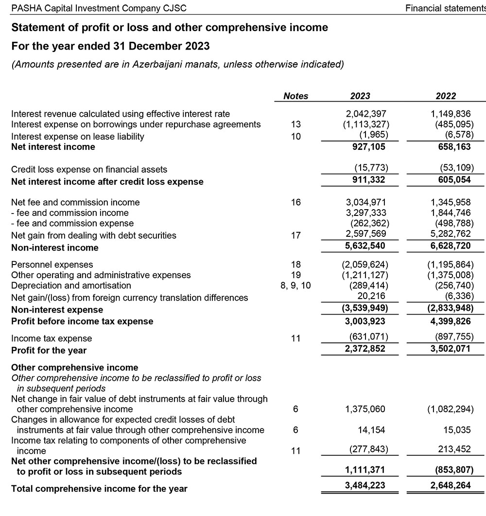 Marja.az Şirkətin illik hesabatına istinadən xəbər verir ki, "PAŞA Kapital İnvestisiya Şirkəti"nin faiz gəliri 2022-ci ildə 1 milyon 150 min manat ikən, 2023-cü ildə 2 milyon 42 min manata yüksəlib (77,6% artıb).