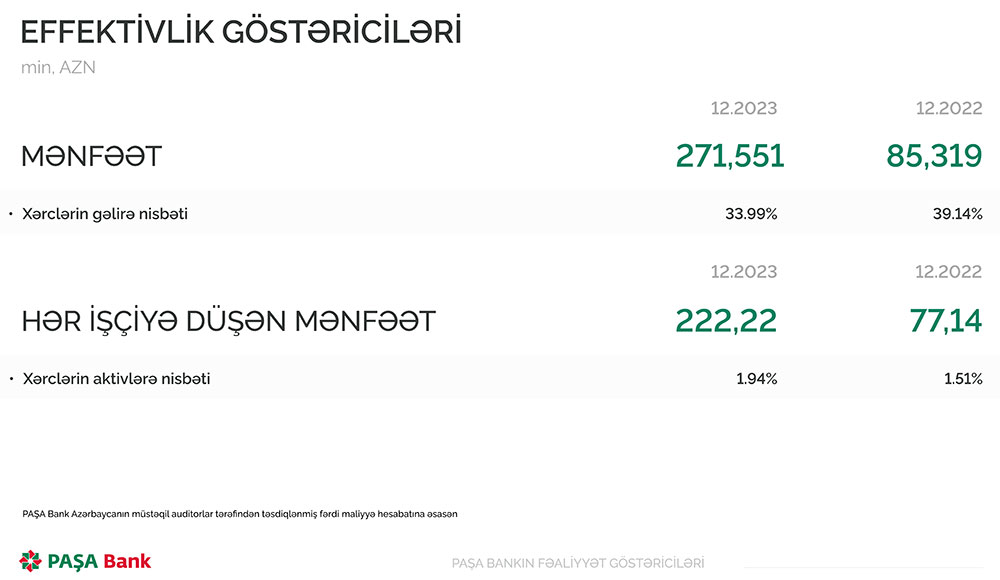"PAŞA Bank" ASC (PAŞA Bank Azərbaycan) 2023-cü ili 271 milyon 551 min manat xalis mənfəət ilə başa vurub. Bu, 2022-ci illə müqayisədə 3,2 dəfə (218.3%) çoxdur.