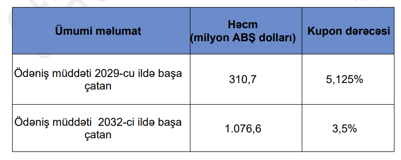 01 yanvar 2025-ci il tarixinə xarici dövlət borcu portfelinin 27,0 faizini və ya 1.387,3 milyon ABŞ dolları məbləğində hissəsini beynəlxalq maliyyə bazarında ticarət olunan xarici valyuta nominallı dövlət istiqrazları (avrobondlar) təşkil edir. Hesabat tarixinə beynəlxalq maliyyə bazarında ticarət olunan dövlət istiqrazları barədə məlumatlar aşağıdakı cədvəldə təqdim olunur.