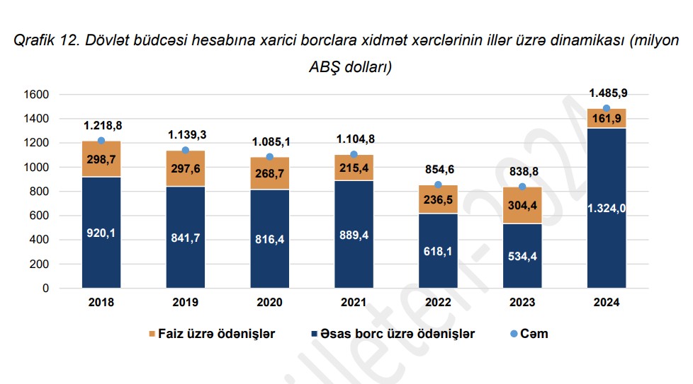 Qeyd olunanlarla yanaşı, 2024-cü il ərzində “Dövlət borcu haqqında” Azərbaycan Respublikasının Qanunu”nun 7.1-ci maddəsinə uyğun olaraq xarici dövlət borcu üzrə 308,8 milyon manat (126,4 milyon manat əsas borc ödənişləri, 182,4 milyon manat faiz ödənişləri) borc ödənişləri “Dövlət borcu və zəmanəti üzrə öhdəliklərin Təminat Fondu”nun vəsaiti hesabına yerinə yetirilmişdir.