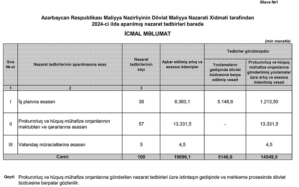 Məlumatda bildirilir ki, 2024-cü ildə Azərbaycan Respublikası Maliyyə Nazirliyinin Dövlət Maliyyə Nəzarəti Xidməti tərəfindən dövlət büdcəsindən vəsait alan 100 təşkilatda nəzarət tədbirləri həyata keçirilib.