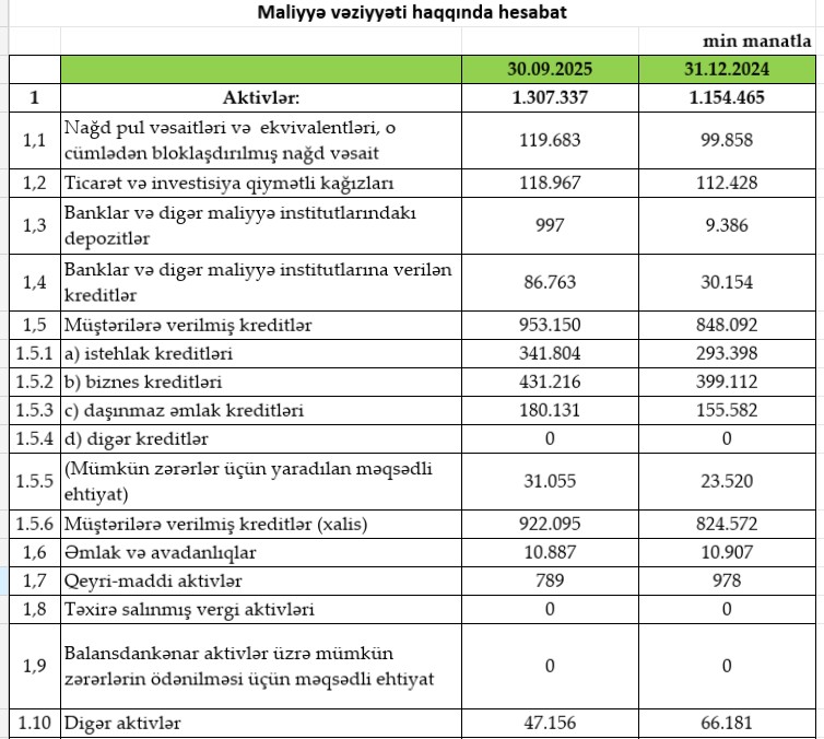 30 sentyabr 2025-ci il tarixinə bankın cəmi aktivləri 1 milyard 307 milyon 337 min manat təşkil edib. Bu, 2024-cü ilin sonu ilə müqayisədə 152 milyon 872 min manat və ya 13,2% artım deməkdir.