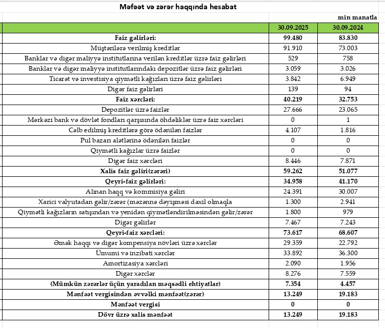 Qeyri-faiz gəlirləri isə 34 milyon 958 min manat olub ki, bu göstərici 2024-cü ilin eyni dövrü ilə müqayisədə 6 milyon 212 min manat və ya 15,1% azalıb.