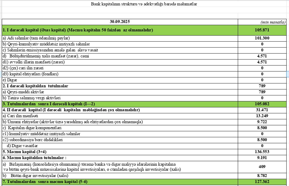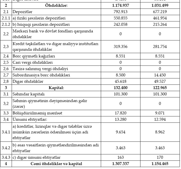 Bankın məcmu kapitalı 127 milyon 362 min manat olub. Ötən ilin sonundakı 132 milyon 138 min manat göstəricisi ilə müqayisədə azalma 4 milyon 776 min manat və ya 3,6% təşkil edib.