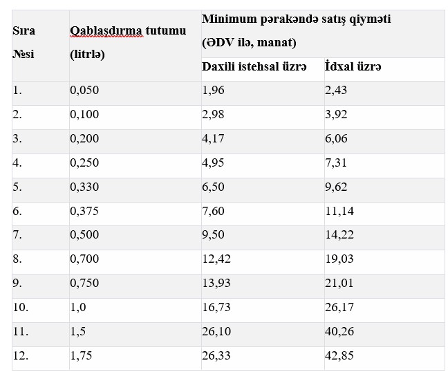 Qəbul edilən qərarla alkoqollu içkilərin pərakəndə satışına dair minimum qiymət aşağıdakı kimidir: