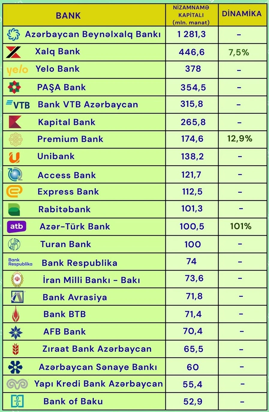 Azərbaycan bank sektoru nizamnamə kapitalı bank kapitalı 22 bank Azərbaycan Beynəlxalq Bankı kapitalı 1 milyard 281 3 milyon manat Xalq Bank kapitalı 446 6 milyon manat Yelo Bank kapitalı 378 milyon manat PAŞA Bank kapitalı 354 5 milyon manat Bank VTB Azərbaycan kapitalı 315 8 milyon manat 200-300 milyon manat kapitala malik banklar 100-200 milyon manat kapitala malik banklar 100 milyon manatdan az kapital bank kapitalının artımı Azər-Türk Bank kapital artımı 2 dəfə Premium Bank kapital artımı 12 9% Xalq Bank kapital artımı 7 5% bank sektoru göstəriciləri bank maliyyə vəziyyəti Azərbaycan bank kapital strukturu bank investisiya potensialı bank dayanıqlığı bank sektorunda islahatlar Azərbaycan Mərkəzi Bankı məlumatları