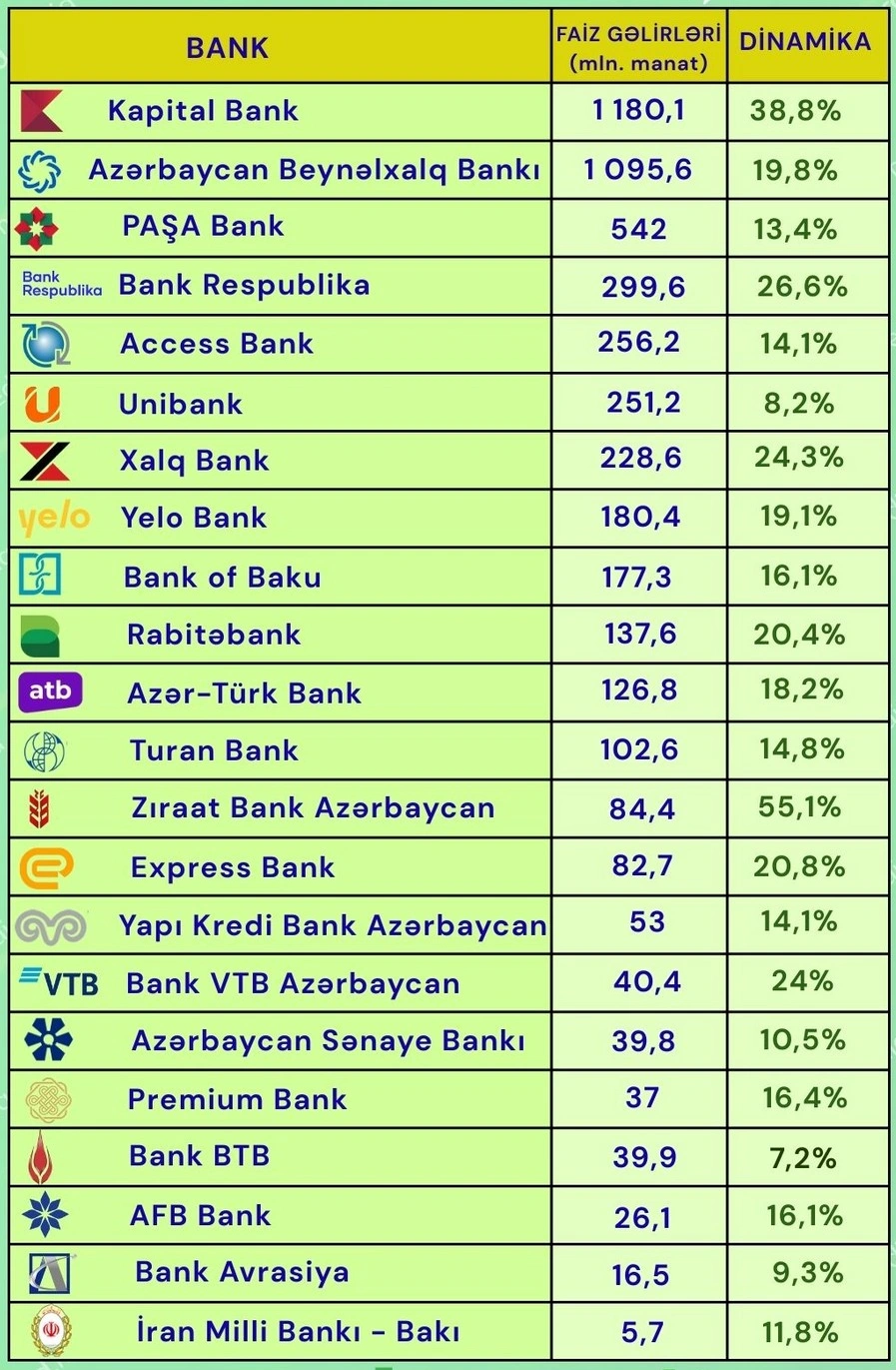 Son 1 ildə 22 bankın hamısının faiz gəlirləri artıb. Ən yüksək dinamika “Zıraat Bank Azərbaycan”da (55,1%), ən aşağı dinamika isə “Bank BTB”də (4,7%) qeydə alınıb.