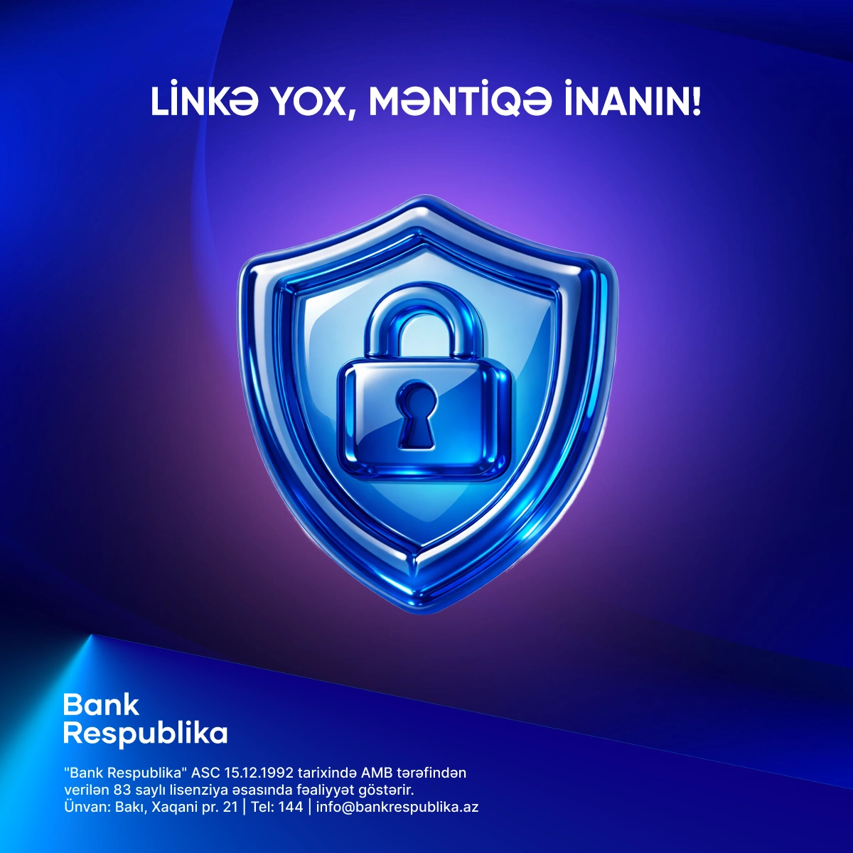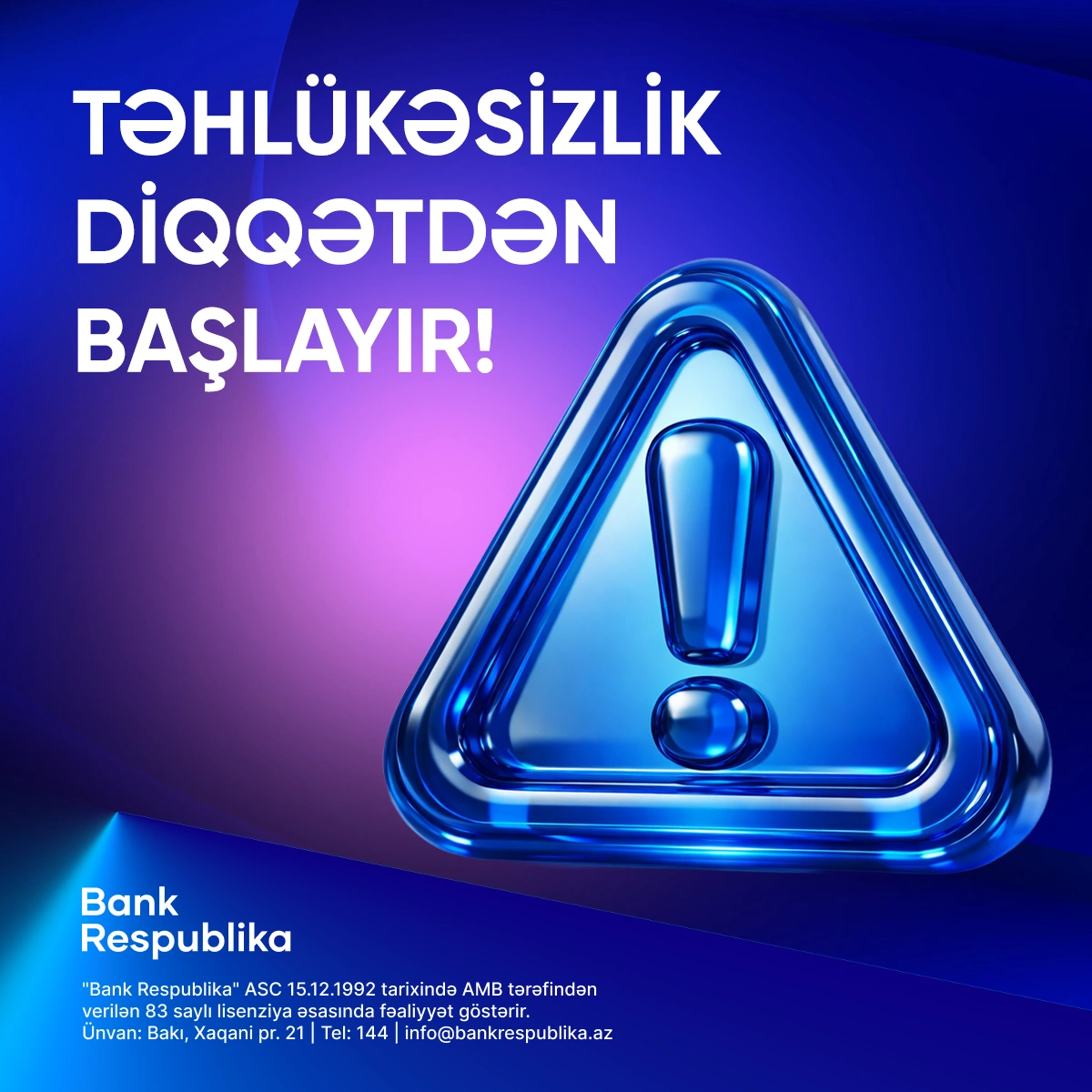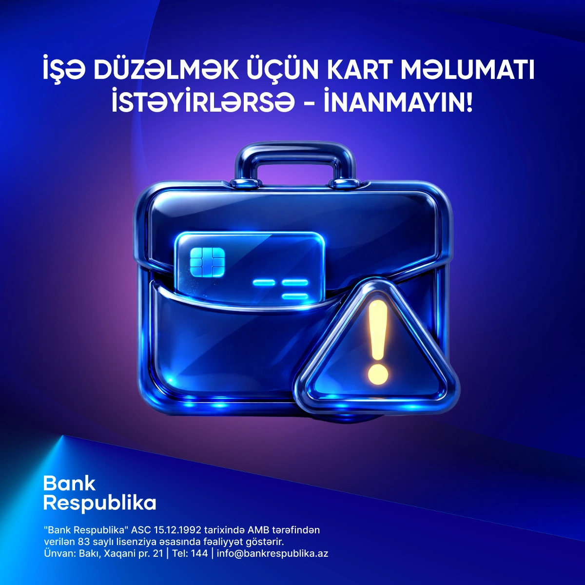 Bank Respublika heç bir halda müştərilərindən telefon, SMS, e-mail və ya sosial şəbəkələr vasitəsilə kartın məxfi məlumatlarını tələb etmir. Şübhəli vəziyyətlə qarşılaşdıqda əməliyyatı dərhal dayandırmaq və bankın rəsmi əlaqə kanalları ilə əlaqə saxlamaq tövsiyə olunur.