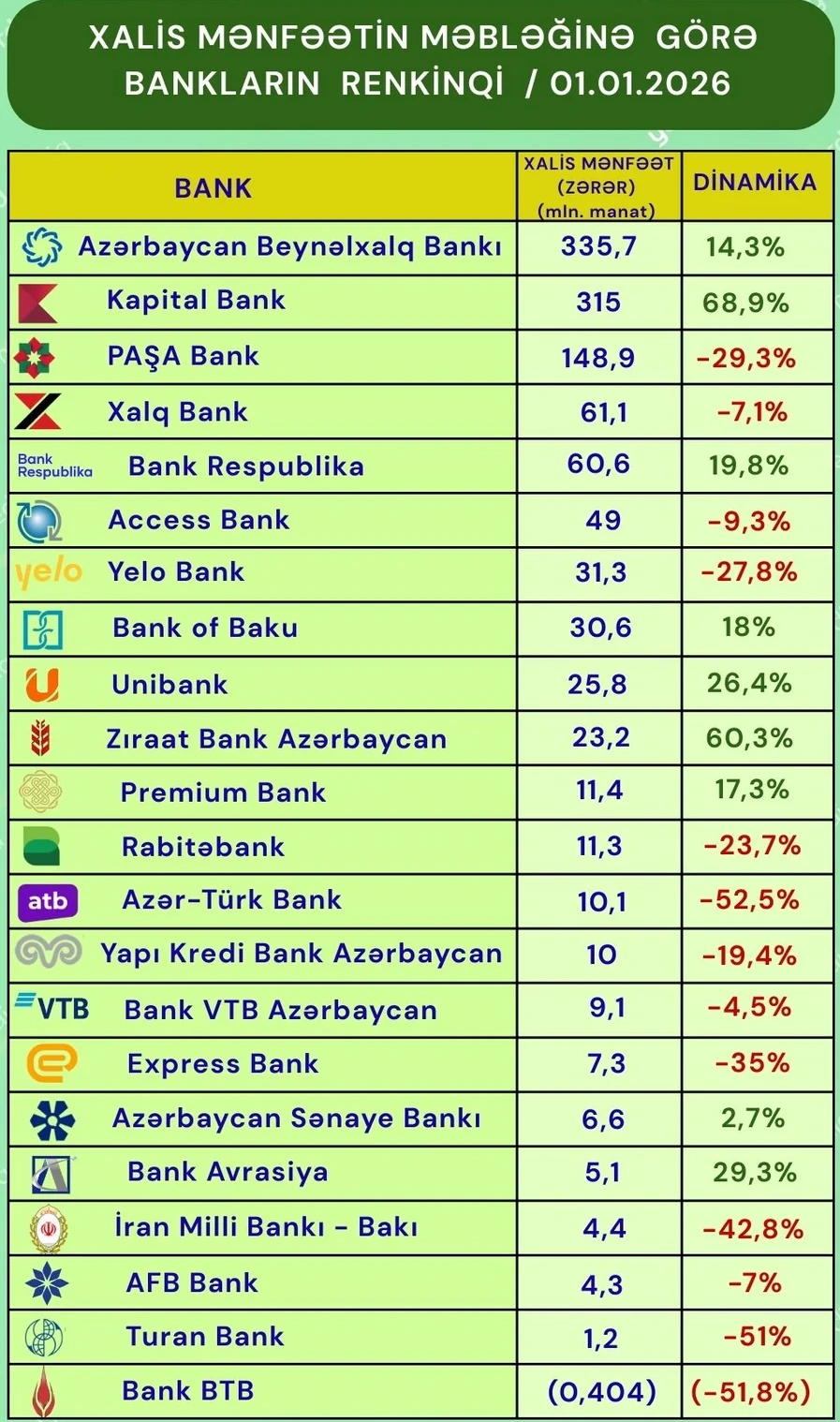 12 bankın xalis mənfəəti isə azalıb. Ən çox azalma “Azər-Türk Bank”da (52,5%), ən az azalma isə “Bank VTB Azərbaycan”da (4,5%) qeydə alınıb. Diqqət çəkən məqam aparıcı 10 bankdan 4-də xalis mənfəətin azalması olub:  “PAŞA Bank” - 29,3%, “Xalq Bank” - 7,1%, "Access Bank" - 9,3% və Yelo Bank - 27,8%.