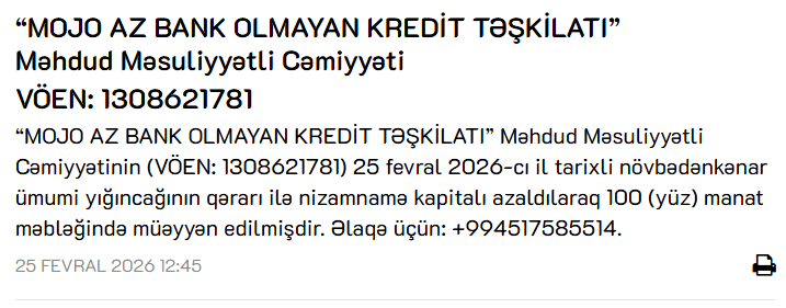 “MOJO AZ BANK OLMAYAN KREDİT TƏŞKİLATI” Məhdud Məsuliyyətli Cəmiyyətinin 25 fevral 2026-cı il tarixli növbədənkənar ümumi yığıncağının qərarı ilə nizamnamə kapitalı 299 min 900 manat azaldılaraq 100 manat məbləğində müəyyən edilib.