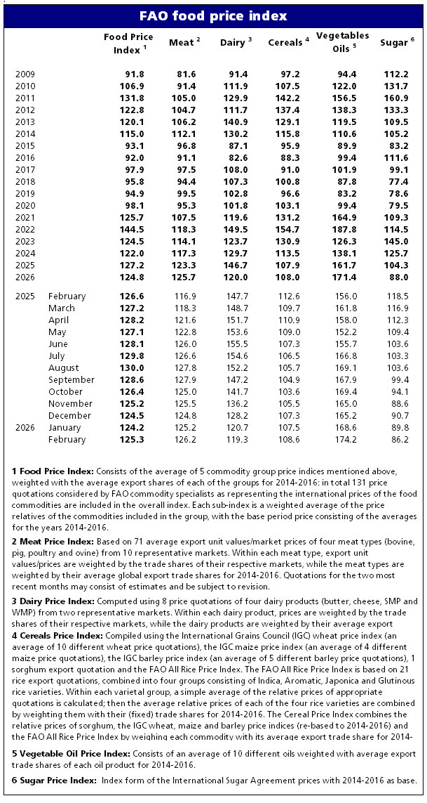 Birləşmiş Millətlər Təşkilatının (BM) Ərzaq və Kənd Təsərrüfatı Təşkilatının (FAO) Ərzaq Qiymətləri İndeksi, taxıl, ət və bitki yağı  qiymətlərindəki artımın təsiri ilə beş ay sonra ilk dəfə yüksəlişə keçib. FAO Ərzaq Qiymətləri İndeksi fevral ayında aylıq müqayisədə 0,9 faiz artarkən, illik müqayisədə 1 faiz azalaraq 125,3 bənd olub.