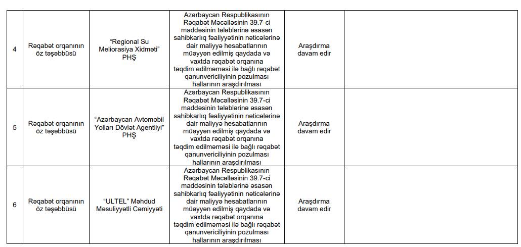 Araşdırmanın nəticələrinə əsasən, rəqabət qanunvericiliyinin pozulması halları və əlamətləri müəyyən edildiyi üçün təbii inhisar subyekti olan "Azərişıq" barəsində iş qaldırılıb.