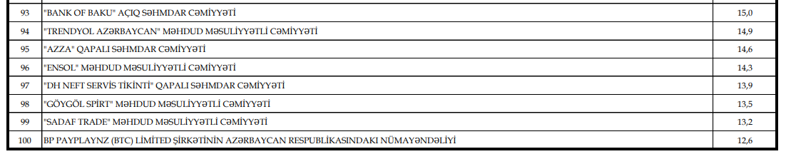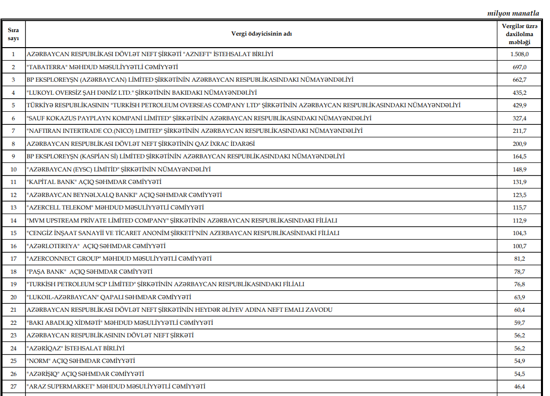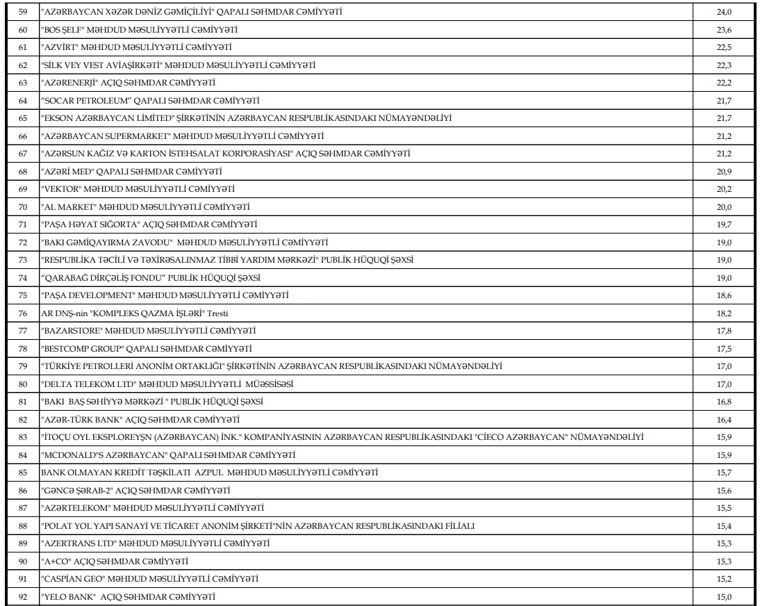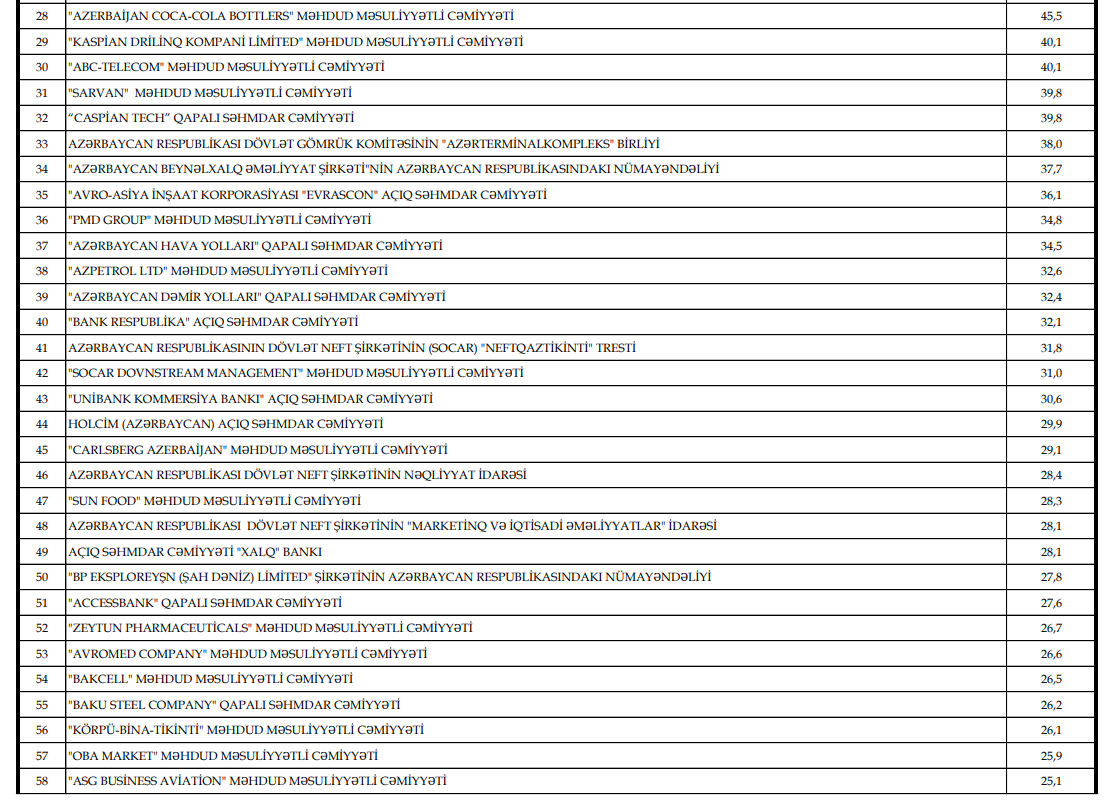 Xəbər verdiyimiz kimi, İqtisadiyyat Nazirliyi yanında Dövlət Vergi Xidməti tərəfindən 2025-ci ildə dövlət büdcəsinə ən çox vergi ödəyən və bu məlumatın ictimaiyyətə təqdim edilməsinə razılıq verən vergi ödəyicilərinin, həmçinin 2025-ci il üzrə dolayı vergilər (ƏDV, aksiz) istisna olmaqla hesablaması ən çox olan və bu barədə məlumatın açıqlanmasına razılıq verən 100 vergi ödəyicilərinin siyahısı hazırlanıb.