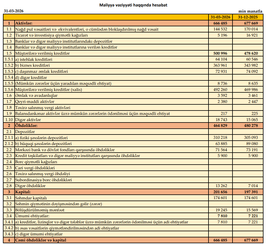 Bank 2025-ci ilin ilk rübünü 1 milyon 582 min manat xalis mənfəət ilə bağlamışdı.