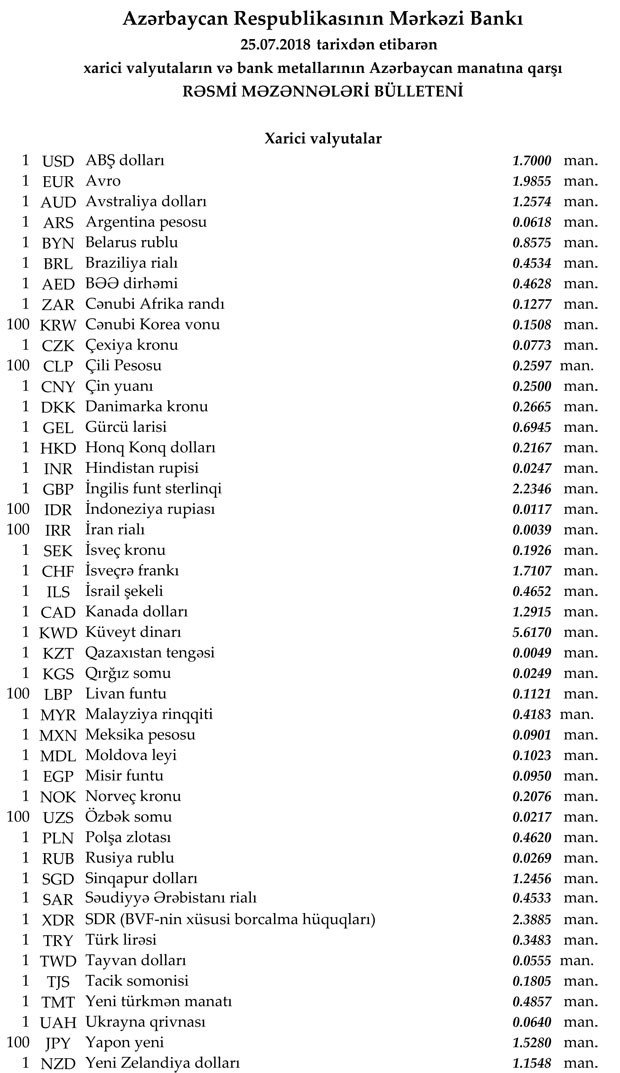 2018-ci ilin İyul ayının 25-nə Mərkəzi Bankın açıqladığı rəsmi Dollar/Manat məzənnəsi İyul ayının 24-ü ilə müqayisədə dəyişməyərək 1,7000 manat olub, Avro/manat məzənnəsi 1.9855 manata qalxıb, Rubl/manat məzənnəsi isə 0,0269 manata düşüb.